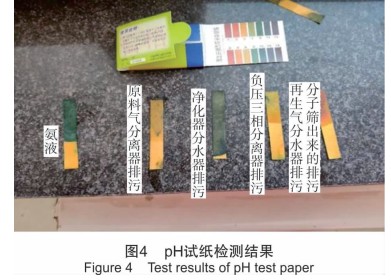 排除上述原因后,隨即對后端設備氣分水器的排污介質進行取樣檢測,結果發(fā)現(xiàn)pH值=0.4,為強酸性,如圖4所示。