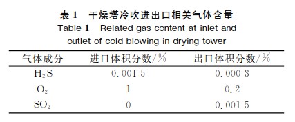 通過干燥塔進出口相關氣體濃度檢測發(fā)現(xiàn),H2S與O2體積分數(shù)出口比進口明顯降低,而SO2含量顯