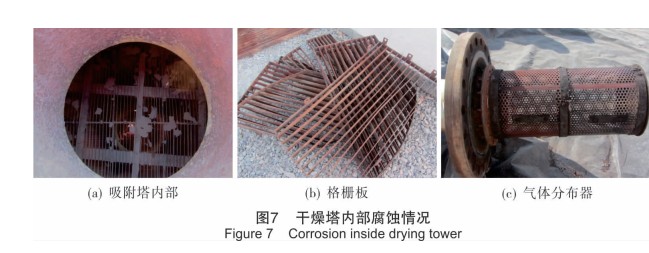分子篩表面的黃褐色物質為亞硫酸鐵。結合干燥塔內部組件腐蝕情況(如圖7所示)分析得出,塔內的格柵